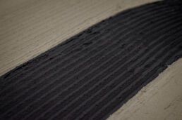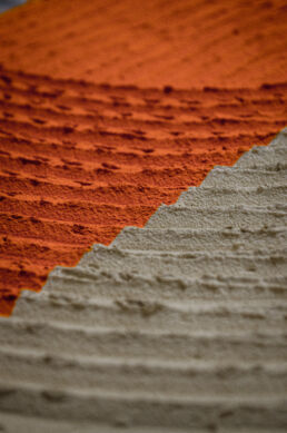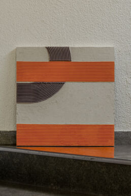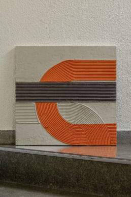 交差する軌跡に、出会いとつながりを。本作は、都市の暮らしと移動を支える、鉄道グループの不動産会社のオフィスに設置されたアートパネル。交差するレールをモチーフに、鉄道のダイナミズムと、人と人との出会い・つながり、そして開発を通じた街の広がりを象徴的に表現しました。校倉(あぜくら)構造を取り入れた立体的な表面は、光の角度によって表情を変え、時間の流れまでも感じさせます。ブランドカラーを想起させるオレンジをアクセントに加え、空間にさりげない個性を添えました。