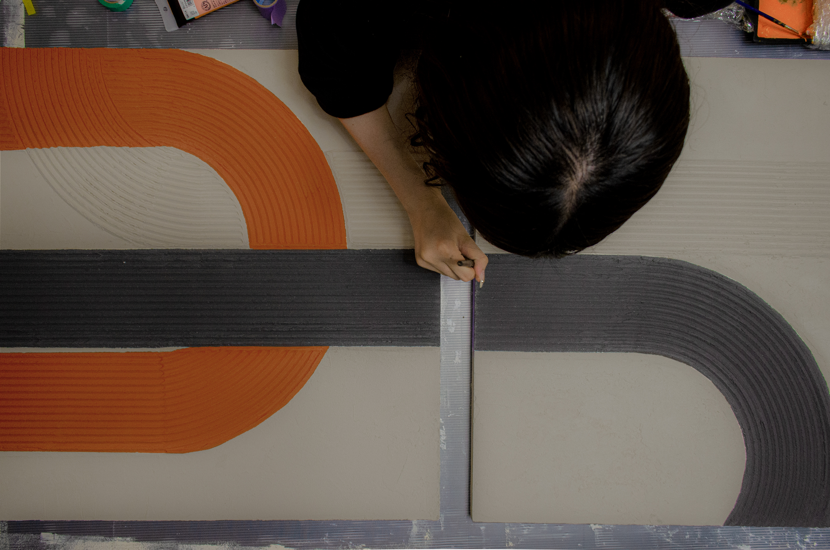 交差する軌跡に、出会いとつながりを。本作は、都市の暮らしと移動を支える、鉄道グループの不動産会社のオフィスに設置されたアートパネル。交差するレールをモチーフに、鉄道のダイナミズムと、人と人との出会い・つながり、そして開発を通じた街の広がりを象徴的に表現しました。校倉(あぜくら)構造を取り入れた立体的な表面は、光の角度によって表情を変え、時間の流れまでも感じさせます。ブランドカラーを想起させるオレンジをアクセントに加え、空間にさりげない個性を添えました。